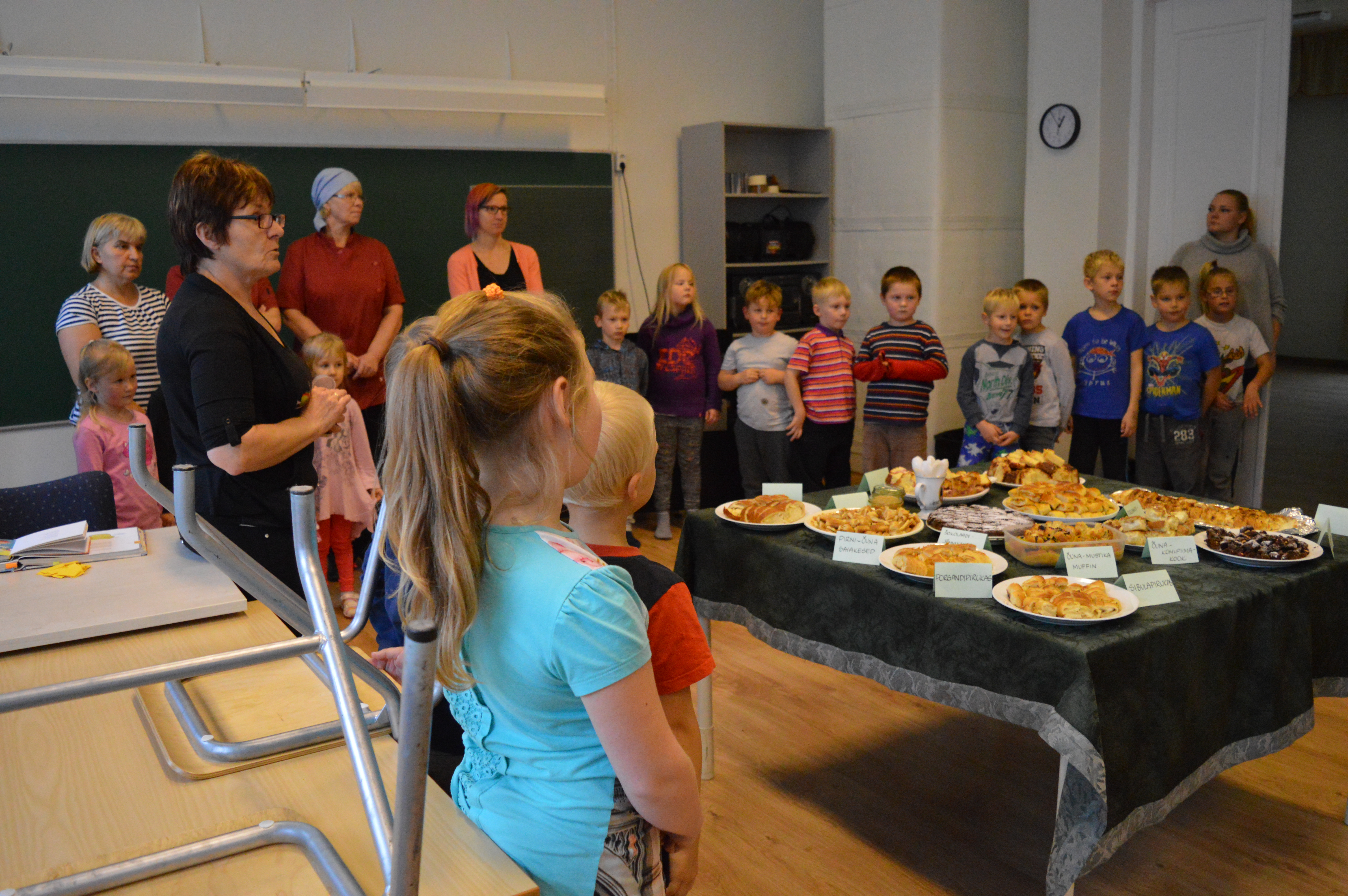 Täna tähistati Pikavere Mõisakoolis sügise algust. Selle puhul olid koolilapsed kodus valmis küpsetanud koogid sügissaadustest ning lasteaed valmis meisterdanud uhked sügiskompositsioonid. Peale lõunasööki koguneti muusikaklassi ning ühise koogisöömise ajal räägiti sügisest.